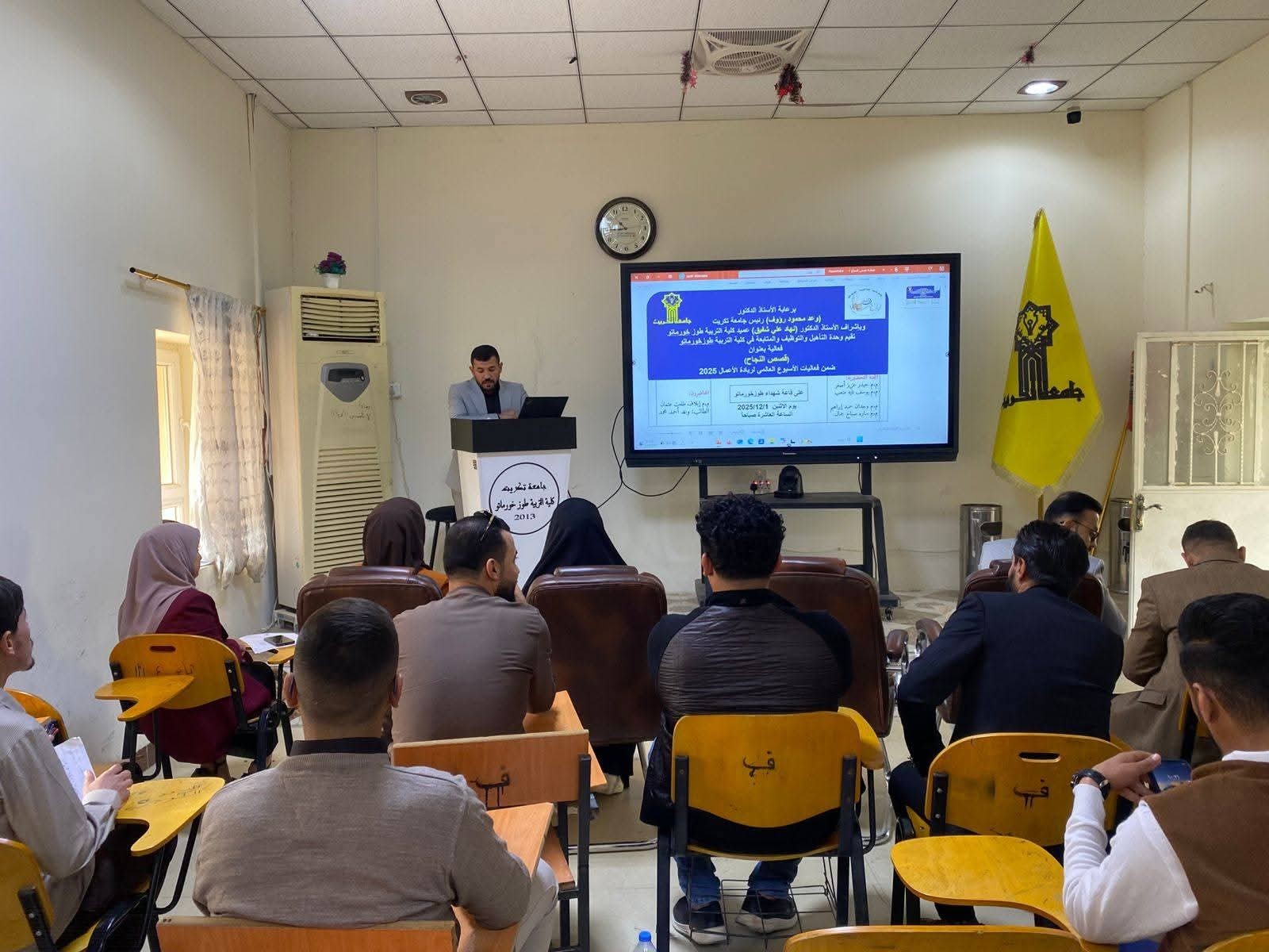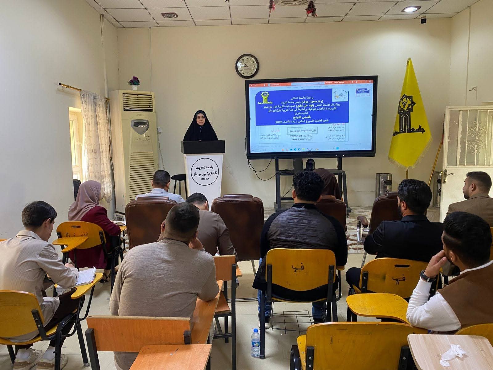 Under the generous patronage of Professor Dr. Wa'ed Mahmoud Raouf, President of Tikrit University, and with the direct supervision and diligent follow-up of Professor Dr. Nihad Ali Shafiq, Dean of the College of Education in Tuz Khurmatu, the Rehabilitation, Employment, and Follow-up Unit at the College of Education, Tuz Khurmatu, organized its intensive knowledge program as part of the activities for Global Entrepreneurship Week 2025, the program featured two distinct courses aimed at developing the skills of students and academics in the fields of the future and entrepreneurship. Both activities were held in the Tuz Khurmatu Martyrs Hall at precisely 10:00 AM, and included: The course, "Artificial Intelligence and Digital Transformation: A Roadmap for the Future of Business," a specialized training course held over two days: Wednesday and Thursday, corresponding to 3-4/12/2025, where the lecturers—Assist. Lect. Najah Madad Wardi, Assist. Lect. Farah Sabah Khalaf, and Assist. Lect. Koun Al Qasim Askar—reviewed the vital importance of digital transformation and artificial intelligence in shaping a clear vision for the future of the business environment and forthcoming professional needs; and the activity, "Success Stories," an inspirational seminar that took place on Monday, 1/12/2025, which focused on fostering a culture of initiative and ambition by reviewing personal successful experiences, with speakers including Assist. Lect. Elaf Talat Othman and student Wa'ed Ahmed Mohammed. This high-quality program underscores the College's commitment to developing its students' skills and preparing them to become active pioneers in the fields of development and modern entrepreneurship. #Division_of_Media_and_Government_Communication College of Education, Tuz Khurmatu - Tikrit University 8/12/2025.